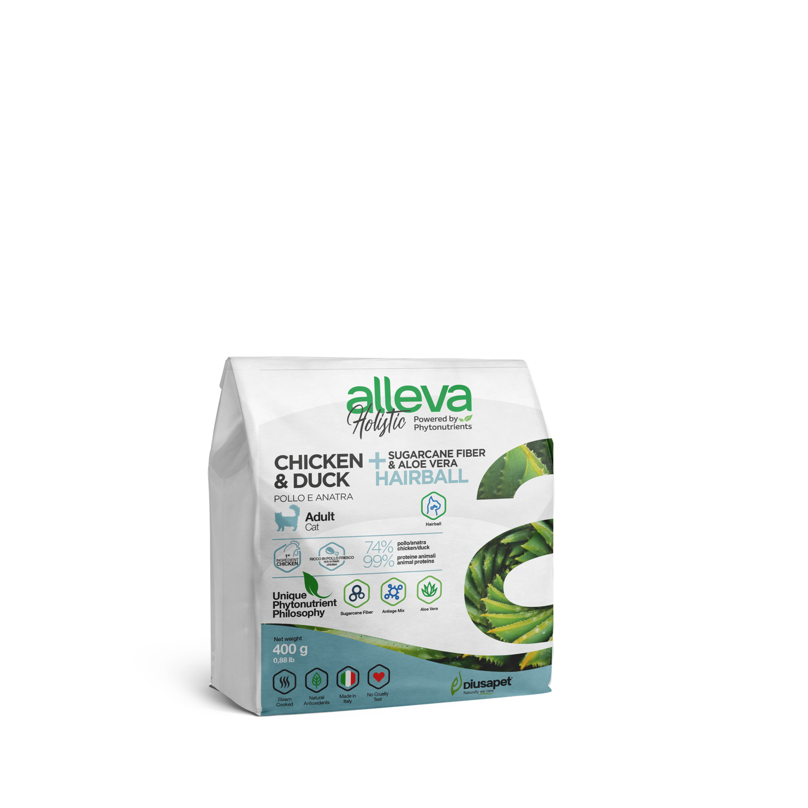 Le crocchette per gatti Alleva Holistic contengono fibra di canna da zucchero e aloe vera, due ingredienti naturali che svolgono un ruolo fondamentale nel mantenimento della salute digestiva. La fibra di canna da zucchero aiuta a regolare il transito intestinale, favorendo la digestione e prevenendo problemi come la stitichezza. L’aloe vera, inoltre, è nota per le sue proprietà lenitive e antinfiammatorie, che possono aiutare a mantenere sano il tratto gastrointestinale del tuo gatto, migliorando l’assorbimento dei nutrienti e riducendo i disagi digestivi.